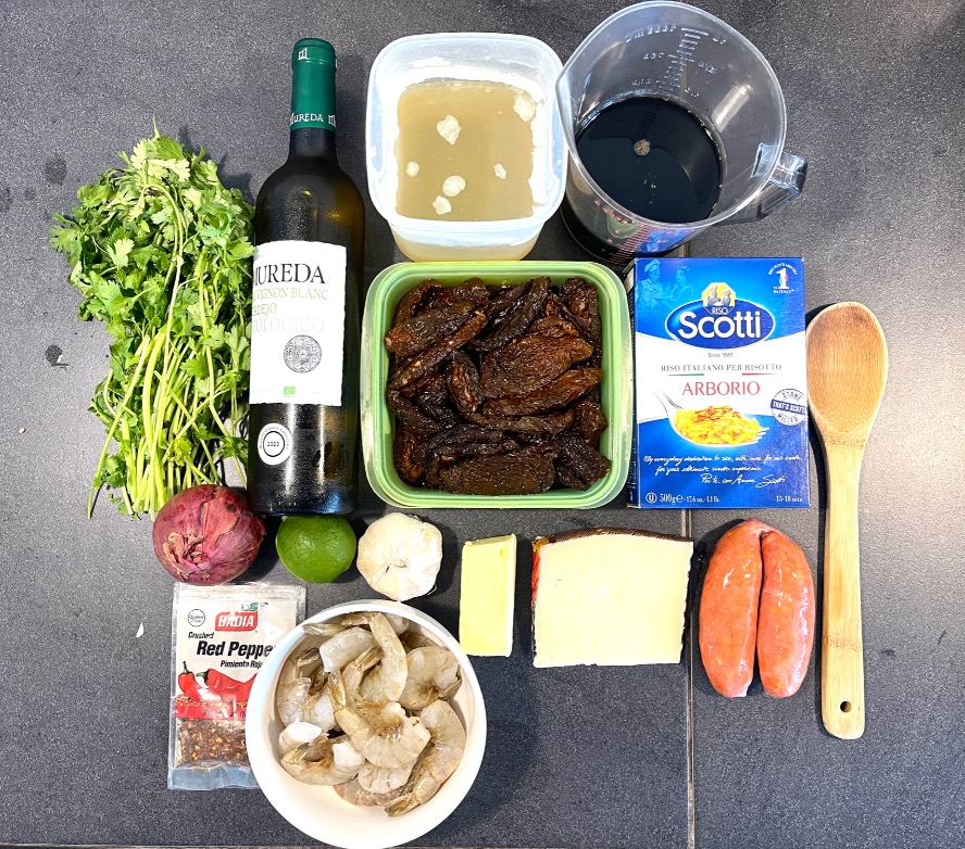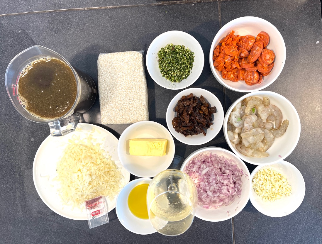Receta de Risotto de camarones con chorizo, tomate seco y queso manchego curado Ibérico.