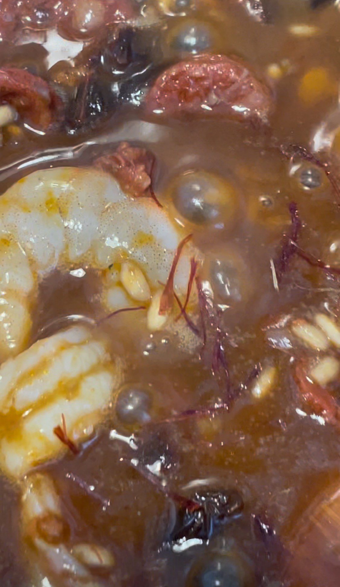 • Caldo. Yo en este caso conserve el agua de hidratar los tomates e hice un caldo con unos hueso de pollo la peladura de los camarones y vegetales de ahí el color oscuro del caldo.