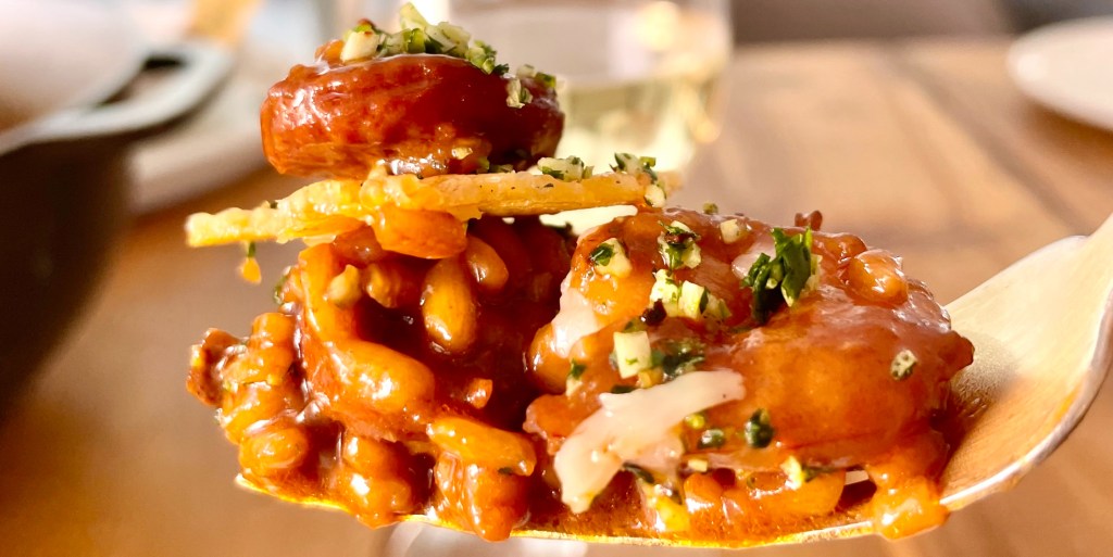Receta completa de risotto de camarones, chorizo, tomate seco, manchego y gremolata.